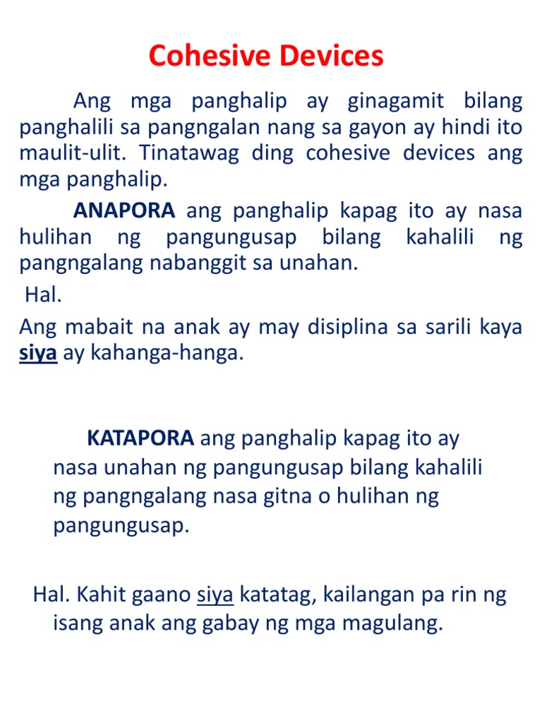 Depinisyon na may English translation ng halimbawa. Katapora - panghalili sa pangngalan na matatagpuan sa unahan ng pangungusap. ANU-ANO ANG COHESIVE DEVICES.