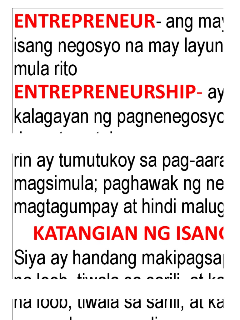 Ano ang ibig sabihin ng entrepreneur. Ano ang kaibahan nang globalisasyon sa ating bansa. Ano ang kahalagahan ng entrepreneurship.