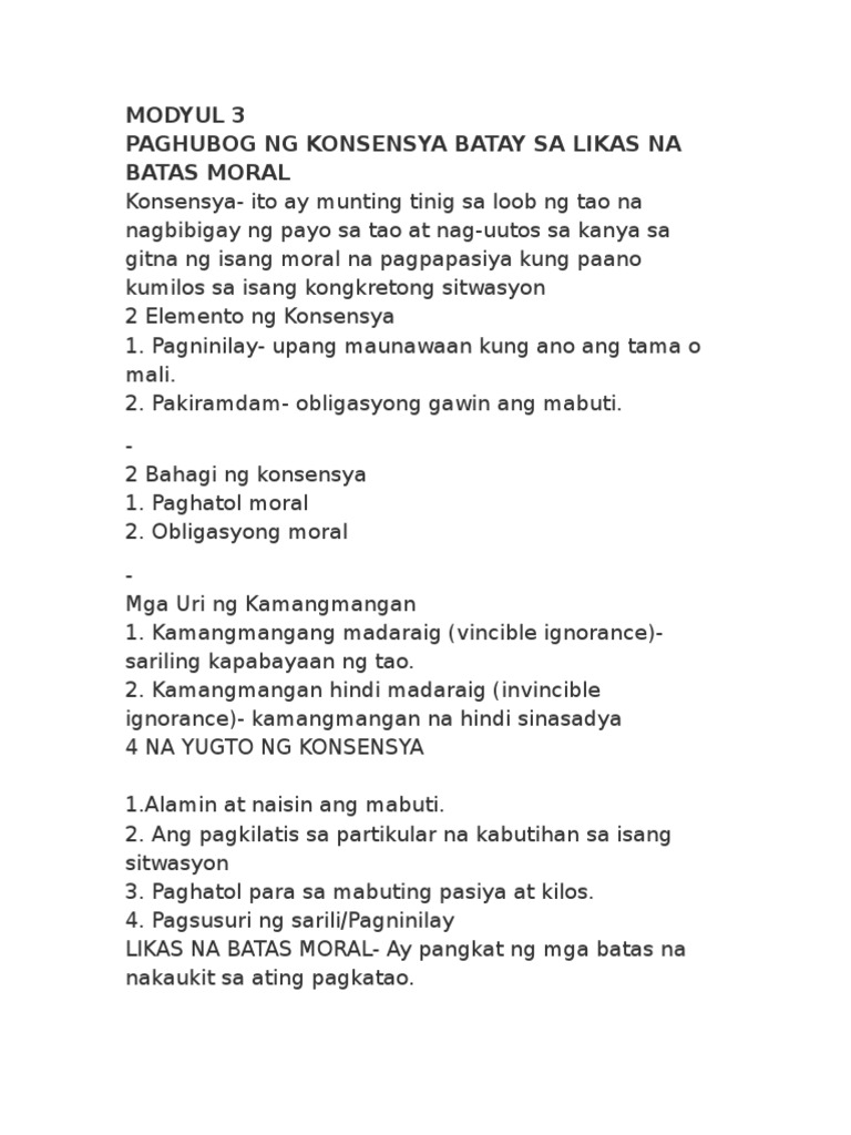 Ang ating konsensya ay ang boses sa na tayo lamang ang makakarinig na nagsasabi kung ang isang bagay o disisyon ay tama o mali. Konsensya Gabay sa Pagsunod sa Likas na batas Moral. Ang modyul na ito ay sadyang binuo upang maunawaan mong mabuti ang mga aralin sa Edukasyon sa.