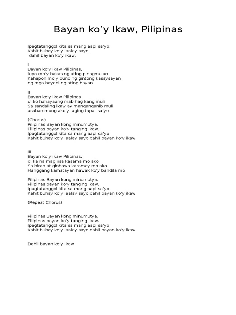 Ang puso ko at buhay man. Di ko babayaang ito ay maagaw Ang mga bayaning. Ang bayan koy tanging ikaw Pilipinas Kong Mahal Ang puso ko at buhay man Sa iyoy ibibigay Tungkulin kong gagampanan Na lagi kang paglingkuran Ang laya moy babantayan Pilipinas kong Hirang.