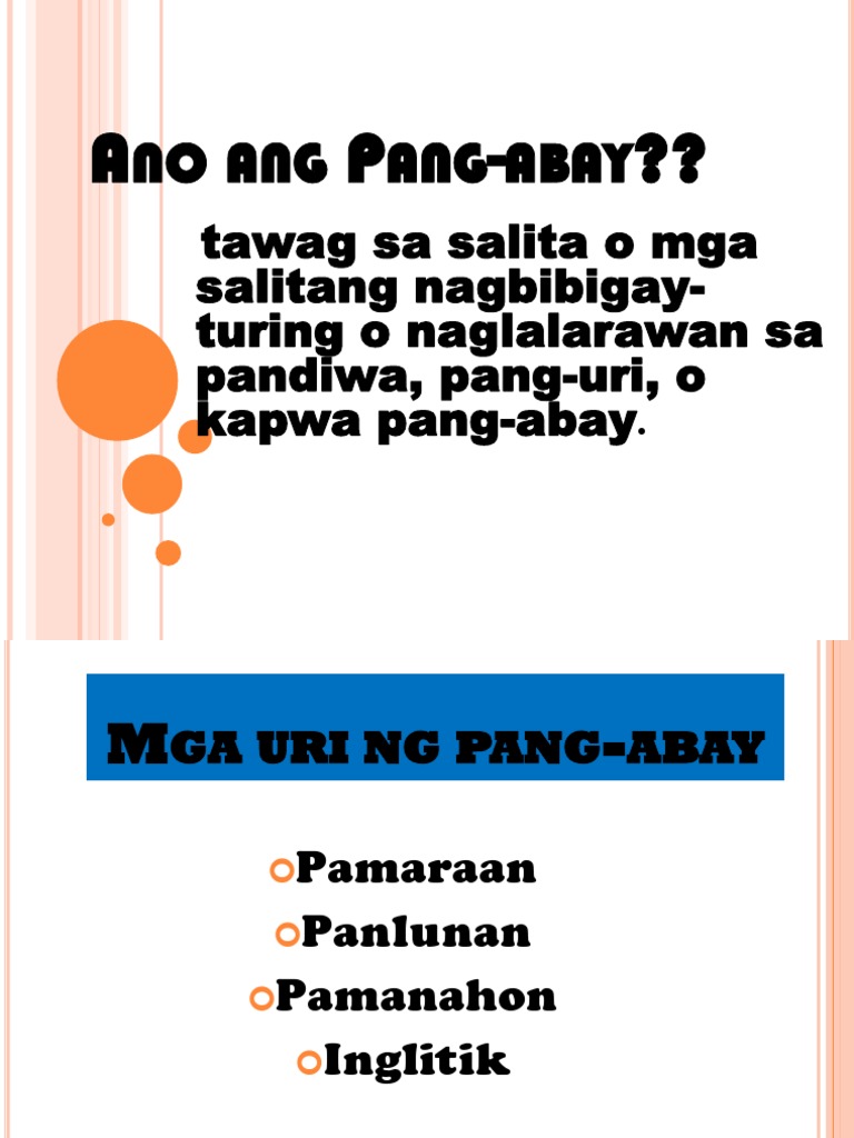 Pang-abay na pamaraan 2. May ibat ibang uri ang pang- abay. Ang pahayag na ito ay binuo upang mabigyan ng angkop na paliwanag ang tungkol sa mga Pang-abay at para mabigyan kayo nga kaalaman tungkol sa Pang-abay.