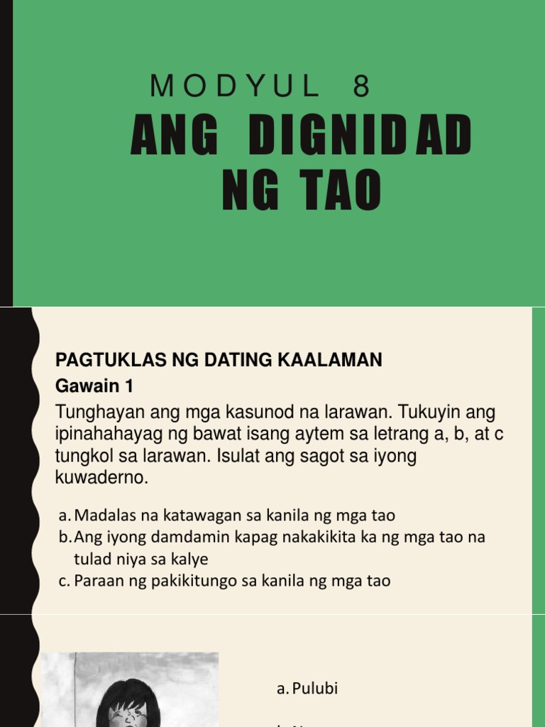Ang mga sumusunod ay nagpapakita ng paggalang sa dignidad ng kapwa maliban sa. Esp 7 Modyul 8 Ang Dignidad Ng Tao. Ano nga ba ang tunay na kahulugan ng Bayanihan2.