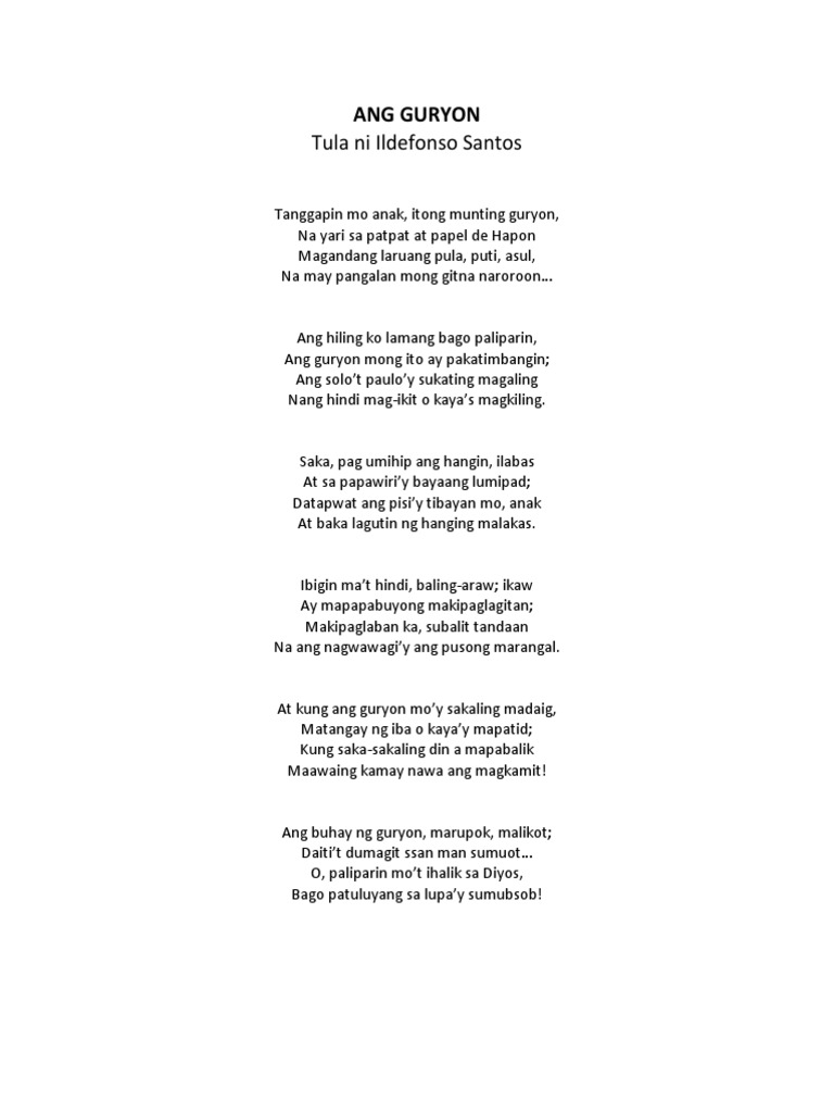 Ipinapahayag nito kung gaano na katayog ang ating pangarap at kung paano natin ito maaabot o makakamtan. Ang Guryon Sa pagsisimula ng Ikalawang markahan Ang Guryon ni Ildefonso Santos ang aming unang Ito ay patungkol sa isang ama na ipinagkaloob ang isang. Ang tulang ito ay isang simbolo ng ating pagkatao pagkamakabansa at sumasalamin sa ating buhay.